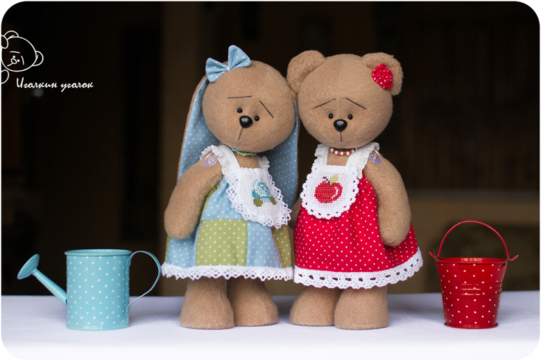 Нет, нет, вылезай из-под стола! Не сама!! Я только горошки добавила. Ведерко и леечка были такого цвета, какими вы их видите. А под них уже шились платья, вышивались мотивчики... Странная, конечно, последовательность - шить игрушку для ведра))))