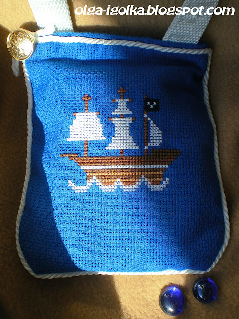 Давно мне хотелось сшить сумочку для сыночка... Несколько месяцев хотелось, пока наконец не вышила кораблик. Потом еще несколько месяцев искала ткань с бело-синими полосками (причем, чтобы синий был именно такого оттенка, как и сумка!) Ничего не нашла, но в пятницу вечером неожиданно для самой себя быстренько сшила сумку.
