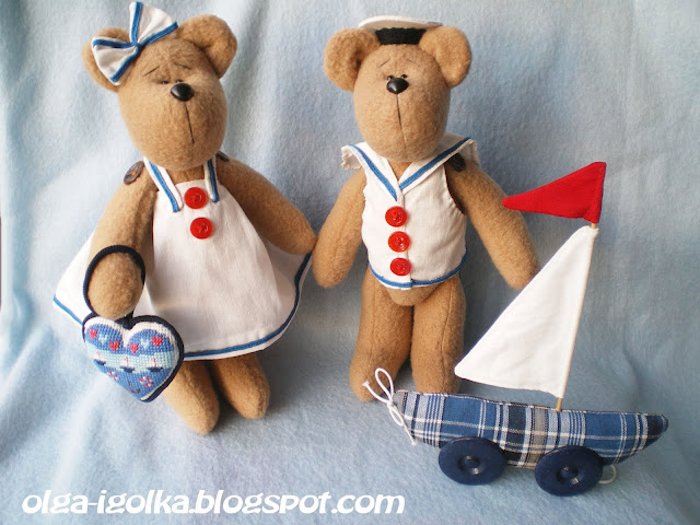 I sewed once Teddy Bear the Sailor for my friend Sasha. But Sasha wouldn't take him... At last he told me happy news - he was going to marry and would bring us a wedding invitation soon! I couldn't but sew Teddy Bear the Sailor's Wife! :)