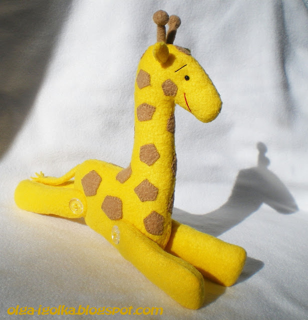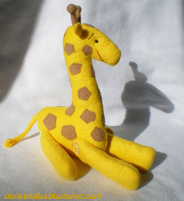 Sewing giraffes is nice. Because they are yellow and sunny! It was not even boring to sew by hand the 24 specks on! This is my second Giraffe and he looks more like a real giraffe than the previous one, I see plainly.