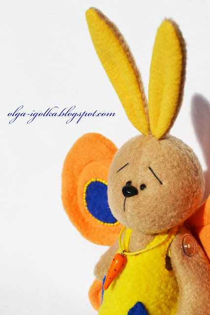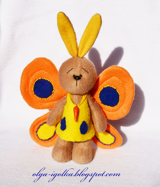 Это была очень интересная просьба сшить маленькую зайку для девушки, которая любит желтый цвет и бабочек. Крылышки на резиночке.