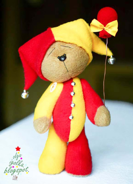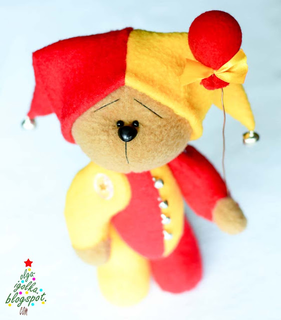 Нина как-то давно говорила, что собирает клоунов. С тех пор я хотела сделать для Нины мишку-клоуна. Долго он стоял в моем списке "Сшить", наконец, я его сшила, а он - шут! :))) Правда, правда! Разве клоуны носят такие шапочки???