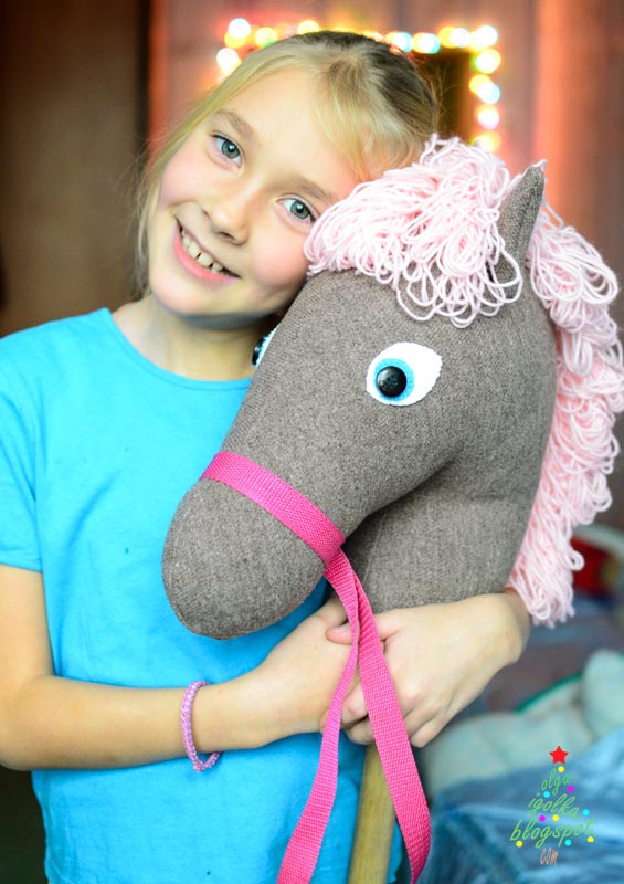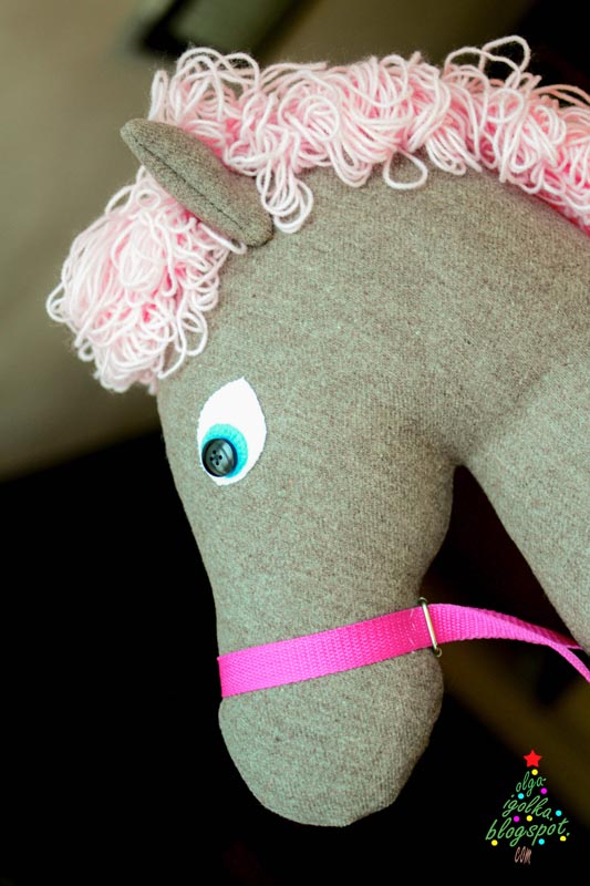 I made a horse head long ago, sewed on ears and stick... It has no eyes and no mane, but Sasha used to play with it anyway. Finally when I saw that the head had got two little eyes painted with a felt pen, I was ashamed. The Hobbyhorse was ready for one Friday night!