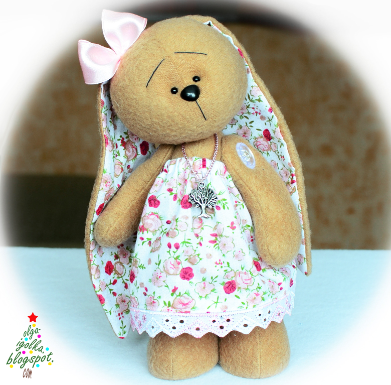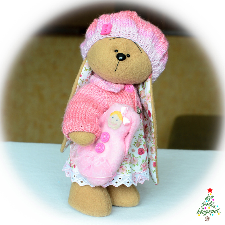 Зайка Верочка. Розовая-розовая. Очень любит сладкую вату и своего зайце-пупсика Люлю. Когда прохладно, ходит в кофточке и именной береточке.