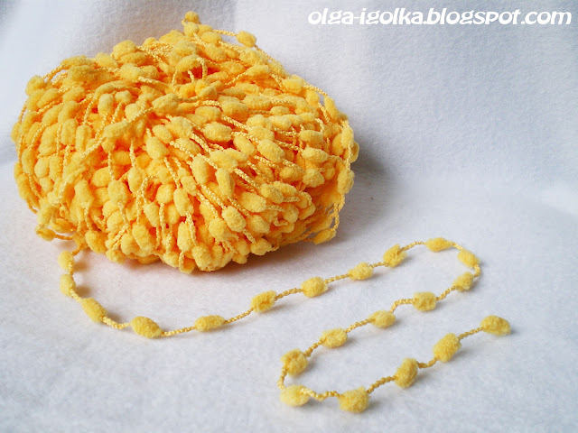 Во-вторых, моточек фантазийной пряжи с бубошками (да, так они и называются)). Я вязала из такой же пряжи такого же цвета шарфик, его можно посмотреть здесь. А вот ссылка на МК по вязанию из подобной пряжи.