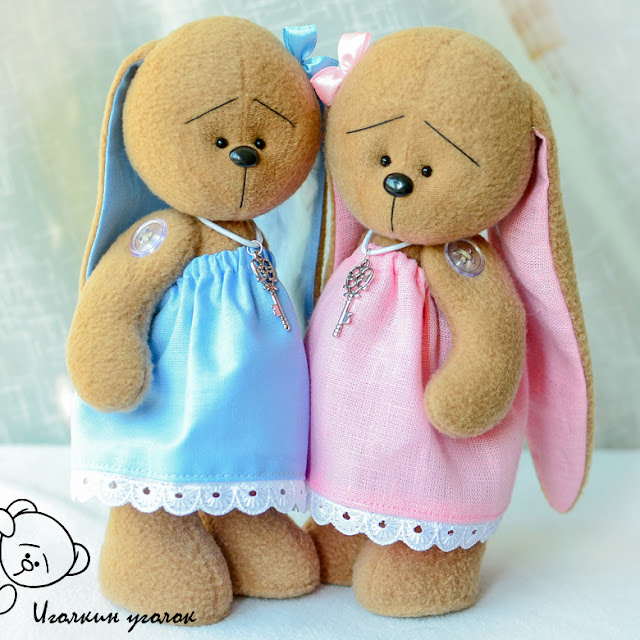 Заек шила до отпуска. Обе поехали к одной маме и должны были быть одинаковыми - вроде как сестрёнки. Но зачем нужны две одинаковые зайки?!?! Поэтому я взяла меланжевую пряжу, одну на двоих, а платья-ушки сделала разными.